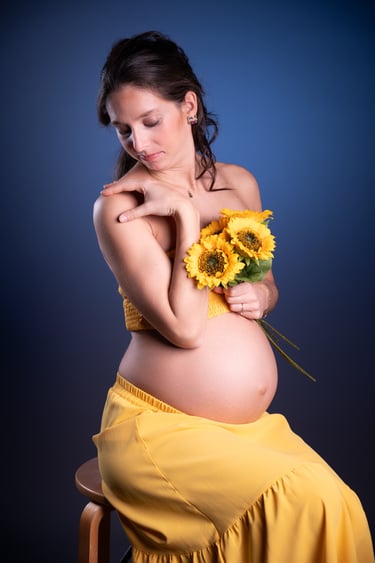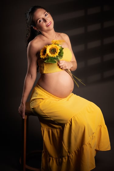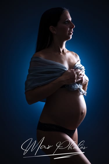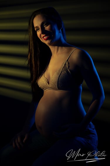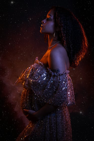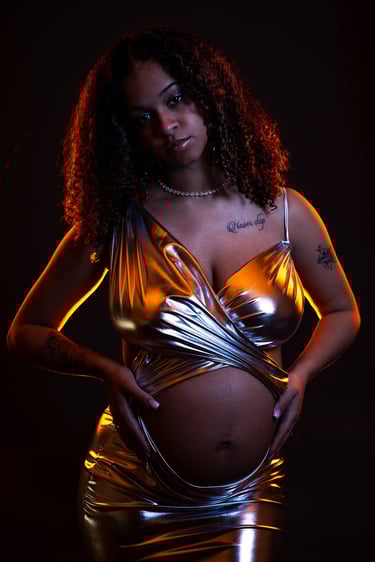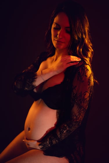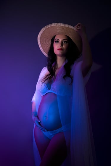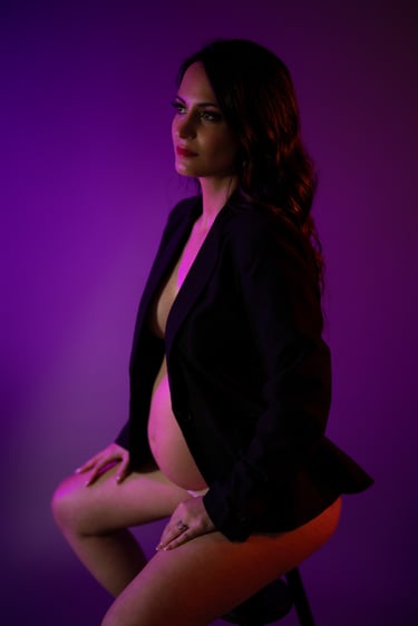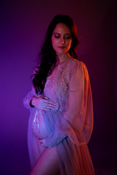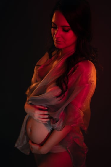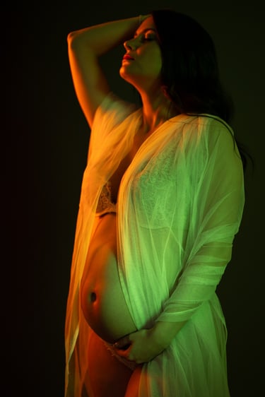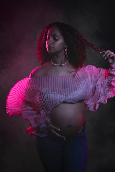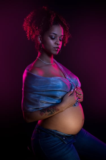 Step into the warm, inviting ambiance of our studio for a maternity photography session that transforms your pregnancy into a work of art. Using rich, dark backdrops and vibrant colored lighting, we create bold, emotive portraits that capture the radiance and strength of this extraordinary moment.