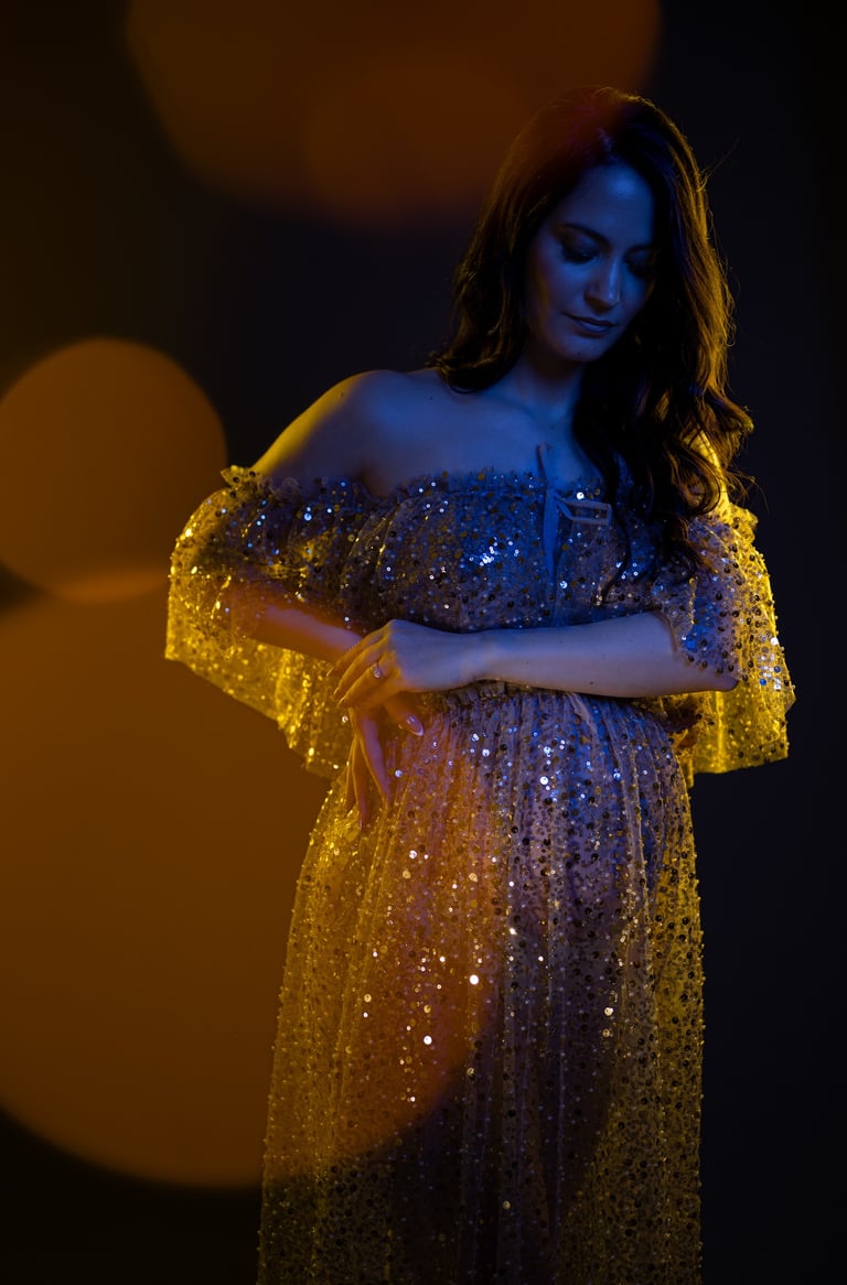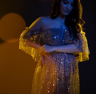 Our carefully curated lighting—featuring soft hues of amber, blush, or deep blue—casts a dreamy glow, highlighting your unique beauty and the emotions of your journey. The dark backgrounds add depth and drama, making every image a striking celebration of love, anticipation, and connection.